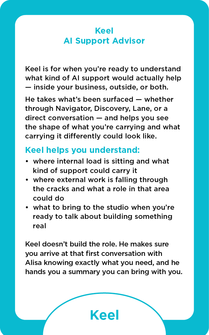 You don’t have to work through all four. Most people start with one and follow the thread from there. If you’re not sure where to begin, Navigator is usually the right first stop. If you already have a sense of what you need and want to talk through what building it could look like, Keel is where that conversation happens.